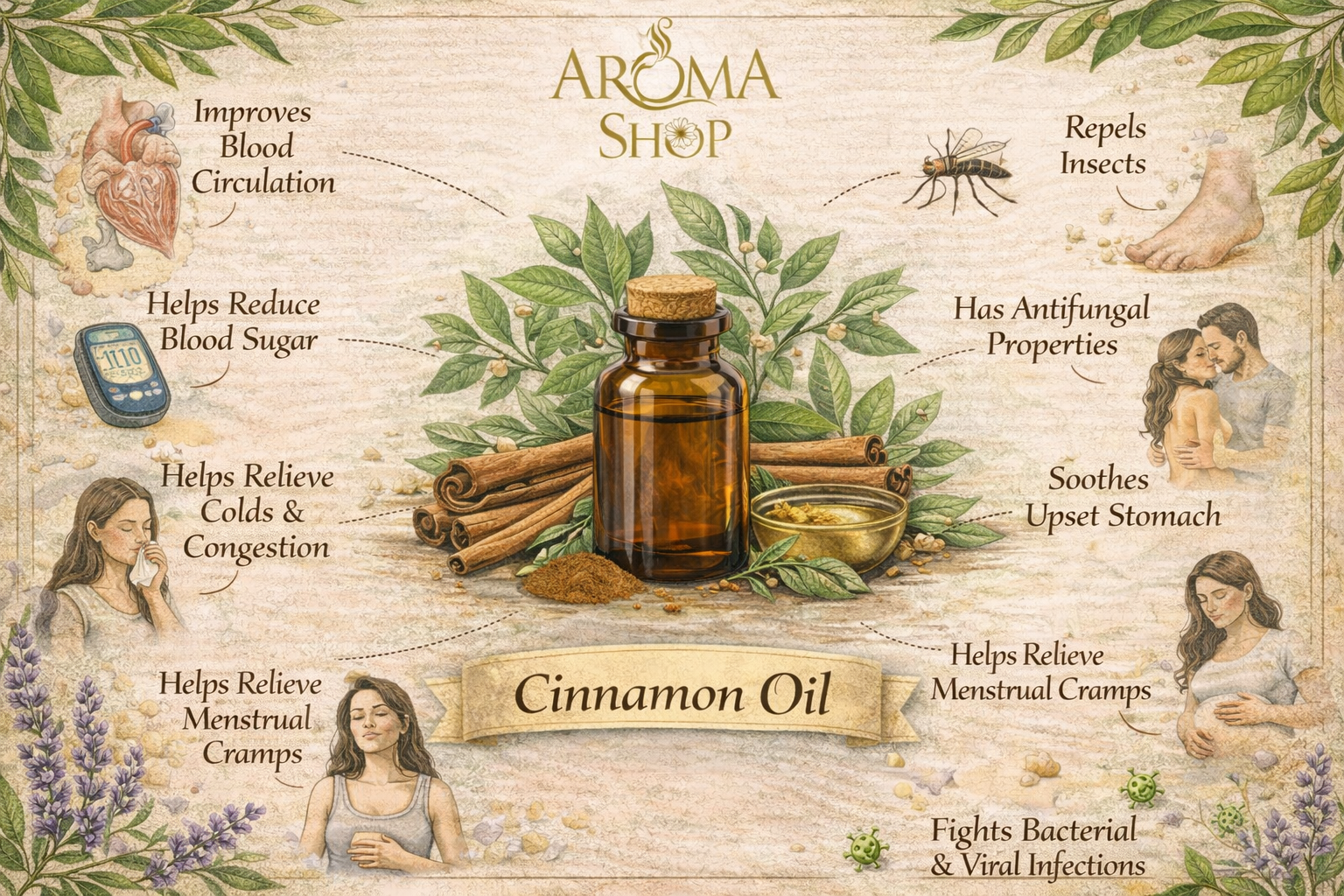 Cinnamon oil can be used for infection of the respiratory tract, rheumatism, arthritis and general pains. It calms an exhausted feeling of depression, tones the whole body and stimulates the glandular system, thus easing period pains.