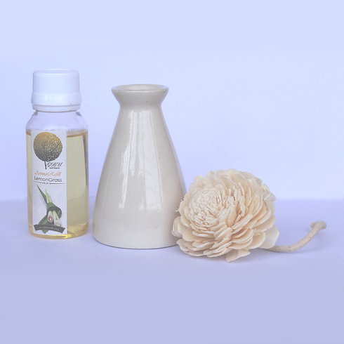 Reed Diffuser spread fragrance continuously and does not require any human assistance once placed. Here is a set of ceramic pot with a sola (plant fiber)flower having cotton wick and a 50ml/500ml bottle of fragrance.